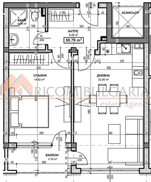Състои се от: антре, кухня с трапезария 22,8кв.м, спалня 14,82кв.м. и баня и тоалет в едно помещение. Излаз на тераса от двете стаи.